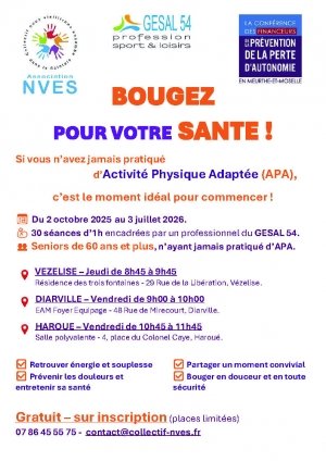 Dans le cadre de ses actions en faveur du bien-vieillir, le Collectif NVES organise, en partenariat avec le GESAL 54, un cycle de séances d'Activité Physique Adaptée (APA) pour débutants, à destination des seniors de 60 ans et plus n'ayant jamais pratiqué d'APA.