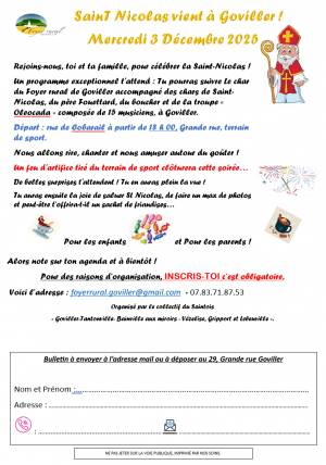 Rejoins-nous, toi et ta famille, pour célébrer la Saint-Nicolas !Un programme exceptionnel t'attend : Tu pourras suivre Le char du Foyer rural de Goviller accompagné des chars de Saint-Nicolas, du père Fouettard, du boucher et de la troupe « Oleocada » composée de 15 musiciens, à Goviller.