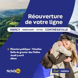Dans le cadre de la réouverture de la ligne férroviaire entre Nancy et Contrexéville, un avis d'enquête publique est ouvert du 15 septembre 2025 à 9h00 au 27 octobre 2025 à 16h00 concernant le dossier présenté par la société NOVA 14, concessionnaire de la Région Grand Est.