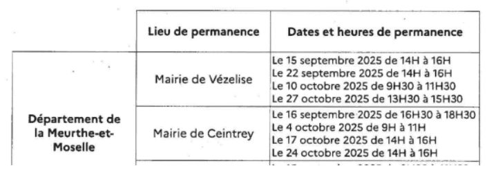 Un registre d'enquête publique à feuillets non mobiles, coté et paraphé par un membre de la commission . d'enquête, sera déposé dans chaqùe lieu de permanence (voir tableau ci-dessous, article· 5) du 15 septembre 2025 à 9H au 27 octobre 2025 à 16H, où les intéressés pourront y consigner leurs observations et.propositions.