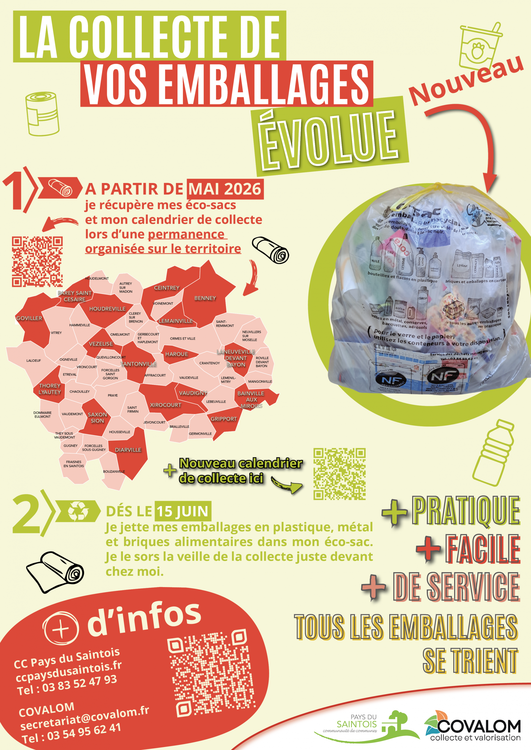 En septembre dernier, afin de faciliter le geste des tri des habitants et d'augmenter les quantités collectées, les élus ont pris la décision d'apporter des changements dans la gestion de la collecte des déchets dans le Saintois. A partir du 15 juin 2026, les emballages recyclables en plastique, métaux et les briques alimentaires seront collectés en porte-à-porte par le service déchets ménagers COVALOM.